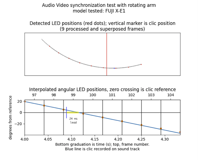 Successive arm positions are used for a linear regression to interpolate the precise time when the arm passes through the reference position, this time value ( video time) is compared to the time detected for the sound pulse in the audio recording, ( audio time). Ideally those time should coincide, and the sync error